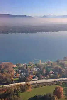 Le Léman se situe à l'ouest de la Suisse et au nord du département français de la Haute-Savoie[17], au pied du massif du Jura[18]. La frontière entre la France et la Suisse, fixée à l'origine par le traité de Lausanne de 1564 entre le duché de Savoie et la Suisse, se trouve sur l'axe du lac jusqu'à ce que celui-ci soit rejoint par le prolongement de la frontière terrestre[19].