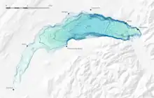 Sa topographie n'est pas directement affectée par son héritage glaciaire au cours duquel des gorges étroites ont été creusées mais l'épaisse couverture sédimentaire (200 m) qui scelle ces paléoreliefs nivelle la surface[74] et forme localement des reliefs de faible amplitude qui témoignent du retrait progressif du glacier du Rhône[75]. La bathymétrie actuelle présente ainsi une morphologie constituée d'un assemblage de fosses et de barres de longueur kilométrique dont la distribution est aujourd'hui contrôlée par les courants transitant à travers le Petit Lac[73].
