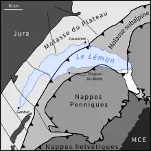 Le bassin lémanique est constitué par trois unités géologiques principales[23],[24]. Les roches sédimentaires mésozoïques du domaine jurassien constituent le substratum rocheux profond dont la partie émergente forme le massif du Jura ainsi que le Salève. Son implication sur le Léman se réduit à la présence d'accidents décrochants qui traversent le bassin lémanique du nord-ouest au sud-est mais sans avoir d'impact sur les dépôts superficiels quaternaires[25]. À la verticale du Léman, ces roches constituent un substratum plongeant sous les reliefs des Préalpes et des massifs cristallins externes dans le cadre de l'orogenèse alpine. La dépression occasionnée par la flexure de la plaque eurasiatique plongeant sous la plaque africaine constitue le bassin d'avant-pays nord alpin dont le remplissage molassique forme l'encaissant du lac. La molasse, datant de l'Oligocène et du Miocène, est subdivisée en deux grands ensembles tectoniques. La molasse du plateau (Chattien - Aquitanien) est très peu déformée et correspond à la moitié nord-ouest de l'encaissant du lac. La moitié sud-est du lac est creusée dans la molasse subalpine ou molasse charriée (Rupélien). Cette dernière chevauche la molasse du plateau et se distingue par de nombreuses déformations entraînant la formation de reliefs d'altitude modérée tels que le mont Pèlerin. La molasse subalpine est surmontée à son tour par les nappes helvétiques des massifs subalpins (massif des Bornes) et ultrahelvétiques à penniques du massif du Chablais (Trias à Éocène). Ces dernières servant aussi localement (Meillerie - Saint-Gingolph) de substrat rocheux au Léman[24]. Ainsi le Grand-Lac repose sur une juxtaposition d’unités tectoniques depuis les nappes penniques des Préalpes jusqu’à la molasse du Plateau tandis que le Petit-Lac est intégralement creusé dans la molasse du Plateau.