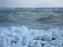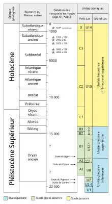 Dans le Grand Lac, ces dépôts sont nettement plus épais que les séries glacio-lacustres (50 à 350 m[24]). Ils sont aussi alimentés par les affluents du Léman mais ils sont surtout entrecoupés par neuf séquences de transport en masse[alpha 3] dans les trente derniers mètres de la séquence lacustre. Ils sont séparés par dépôts argilo-silteux laminés de sédiment hémipélagique d'épaisseur décimétrique. Ces dépôts massifs résultent d’évènements ponctuels comme celui du Tauredunum qui se sont produits entre 3 895 ± 225 ans AP et 1 387 ans AP[54]. Ces dépôts chaotiques à dominante argileuse ont une épaisseur qui varie entre 2 et 10 m d'épaisseur et sont globalement évalués entre 1 et 250 millions de m3 de sédiments[alpha 4]. Ils résulteraient d'instabilité de pente, les niches d'arrachements demeurent visibles sur les versants nord et sud du Grand Lac, ou d'effondrement du delta du Rhône, ce dernier générant les plus gros volumes de transport en masse. Ces différents évènements sont eux-mêmes provoqués par des séismes, des surcharges sédimentaires voire des modifications de pressions dans le sédiment engendrées par les résurgences au fond du lac. Plusieurs d'entre eux sont ainsi corrélés avec des évènements sismiques comme le tremblement de terre d'Aigle en 1584, celui de l'Âge de Bronze précoce (3 695 ans AP) et de 2 200 ans AP. Quatre autres sont attribués à des effondrements de delta dont le plus récent est celui du Tauredunum ce qui suggère un taux de récurrence de 300 à 500 ans. Le volume des dépôts les plus importants serait suffisant pour générer un tsunami dont la hauteur des vagues pourrait atteindre de 1 à 3 m de haut voire plusieurs mètres de haut pour l'épisode du Tauredunum.