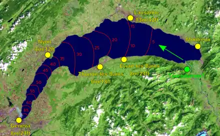 Le niveau du lac est régulé artificiellement à une altitude fluctuant entre 371,7 et 372,3 mètres depuis 1884[20]. L'altitude moyenne de la surface du lac, mesurée entre 1943 et 2008, se trouve à 372,05 mètres ; son altitude minimum a été mesurée à 371,78 mètres en 1949 et son maximum à 372,19 mètres en 1977. La profondeur maximale du Léman se situe à 309,7 mètres au-dessous de la surface du lac, tandis que la profondeur moyenne du lac est de 152,7 m[21].