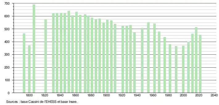 L'évolution du nombre d'habitants est connue à travers les recensements de la population effectués dans la commune depuis 1793. Pour les communes de moins de 10 000 habitants, une enquête de recensement portant sur toute la population est réalisée tous les cinq ans, les populations légales des années intermédiaires étant quant à elles estimées par interpolation ou extrapolation[27]. Pour la commune, le premier recensement exhaustif entrant dans le cadre du nouveau dispositif a été réalisé en 2006[28].