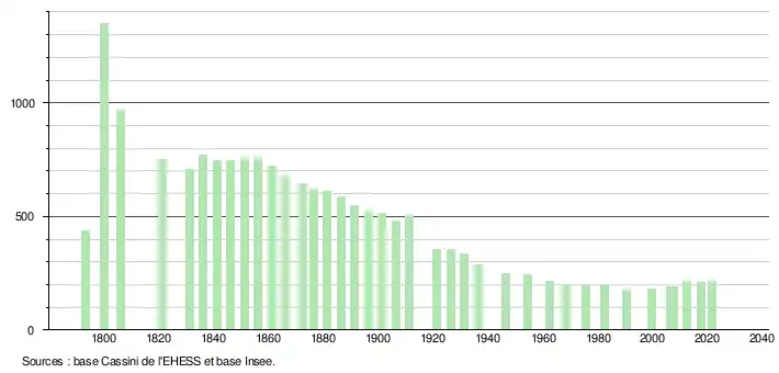 L'évolution du nombre d'habitants est connue à travers les recensements de la population effectués dans la commune depuis 1793. Pour les communes de moins de 10 000 habitants, une enquête de recensement portant sur toute la population est réalisée tous les cinq ans, les populations légales des années intermédiaires étant quant à elles estimées par interpolation ou extrapolation[27]. Pour la commune, le premier recensement exhaustif entrant dans le cadre du nouveau dispositif a été réalisé en 2007[28].