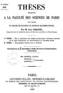 - Léon Charve, « De la réduction des formes quadratiques ternaires positives et de son application aux irrationnelles du troisième degré », Annales de l’École normale supérieure, 2e série, vol. 9, , p. 3-156 (lire en ligne, consulté le ).