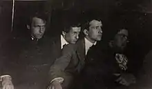 Debout : N.D. Burliouk, D.D. Burliouk, V.V. Maïakovski