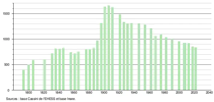 L'évolution du nombre d'habitants est connue à travers les recensements de la population effectués dans la commune depuis 1793. Pour les communes de moins de 10 000 habitants, une enquête de recensement portant sur toute la population est réalisée tous les cinq ans, les populations légales des années intermédiaires étant quant à elles estimées par interpolation ou extrapolation[17]. Pour la commune, le premier recensement exhaustif entrant dans le cadre du nouveau dispositif a été réalisé en 2007[18].