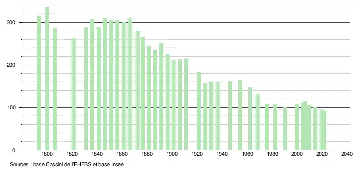 L'évolution du nombre d'habitants est connue à travers les recensements de la population effectués dans la commune depuis 1793. Pour les communes de moins de 10 000 habitants, une enquête de recensement portant sur toute la population est réalisée tous les cinq ans, les populations légales des années intermédiaires étant quant à elles estimées par interpolation ou extrapolation[16]. Pour la commune, le premier recensement exhaustif entrant dans le cadre du nouveau dispositif a été réalisé en 2004[17].