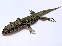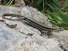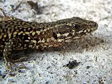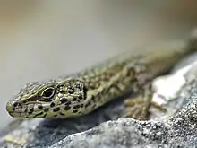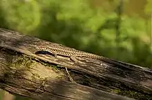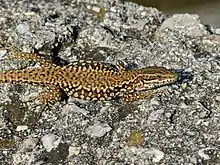 Le Lézard des murailles (Podarcis muralis) est une espèce de Lacertilia (parfois nommés Sauria) de la famille des Lacertidae[1]. Ce petit lézard est originaire d'Europe continentale, plus précisément des régions italiennes et balkaniques[2]. Il est largement présent dans tous les pays d'Europe méditerranéenne ou limitrophes, mais pas dans les îles de Méditerranée. Il a été introduit en Amérique du Nord et en Angleterre[3].