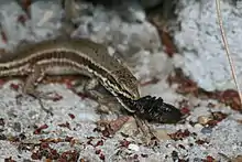 Dès la sortie de l’œuf, le jeune lézard chasse tout de suite de petits insectes pour se nourrir[13].