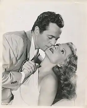 Larry Parks, Rita Hayworth et Roland Culver sur le tournage du film
