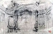 Un riche appartement dans le palais du tsar. À gauche, une porte donnant sur les jardins. À droite, une porte conduisant aux appartements du palais. Au fond du théâtre, une grande fenêtre ouvrant sur le parc.