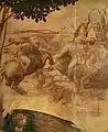 Daniel Arasse voit dans le tableau de Léonard une réponse à L'Adoration des mages de Botticelli où la Vierge est déjà figurée au centre de la composition. Mais Léonard aurait abaissé le groupe de la Vierge et des Rois mages, pour donner un rôle majeur au fond, en particulier à la bataille entre Cavaliers, symbole de la bestializza piazza , « folie très bestiale, qui, dans le combat, assimile l’homme à la bête »[4]. Ce combat a donné lieu à d’autres interprétations : pour Charles Sterling, il évoquerait l’inimité entre les trois mages venus de pays différents. Pour Andrea Natali, il signifierait la défaite de l’ignorance, du mal et de la violence, selon la doctrine augustinienne des moines de San Donato[5].