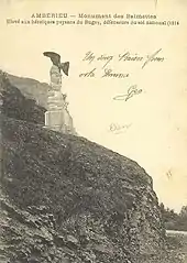 - un haut-relief en pierre représentant formé d'un Torciolan armé guettant la vallée de l'Albarine et d'une femme tenant un étendard. Clément Rocheray, une figure locale, aurait pu servir de modèle au sculpteur ;