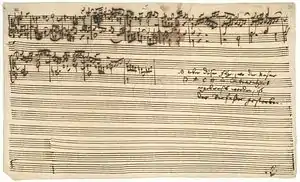 - cinq pages autographes portant la fugue inachevée sur deux portées. Elles dateraient de la période 1748 - [2]. La dernière page comporte la fameuse annotation manuscrite (de C. P. E. Bach ?) selon laquelle la mort de l'auteur a interrompu le manuscrit, une note autographe (ou de Johann Friedrich Agricola) « und einen andern Grund Plan » (« et une autre structure »), et une liste d'erreurs d'impression au verso de la quatrième page, portant sur les contrepoints VIII à XI, sans doute de la main de C. P. E. Bach ;