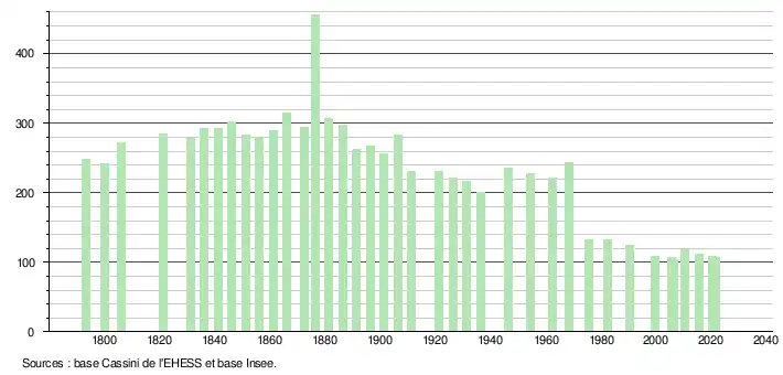L'évolution du nombre d'habitants est connue à travers les recensements de la population effectués dans la commune depuis 1793. Pour les communes de moins de 10 000 habitants, une enquête de recensement portant sur toute la population est réalisée tous les cinq ans, les populations légales des années intermédiaires étant quant à elles estimées par interpolation ou extrapolation[15]. Pour la commune, le premier recensement exhaustif entrant dans le cadre du nouveau dispositif a été réalisé en 2005[16].