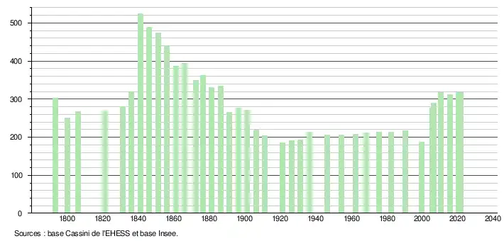 L'évolution du nombre d'habitants est connue à travers les recensements de la population effectués dans la commune depuis 1793. Pour les communes de moins de 10 000 habitants, une enquête de recensement portant sur toute la population est réalisée tous les cinq ans, les populations légales des années intermédiaires étant quant à elles estimées par interpolation ou extrapolation[26]. Pour la commune, le premier recensement exhaustif entrant dans le cadre du nouveau dispositif a été réalisé en 2005[27].
