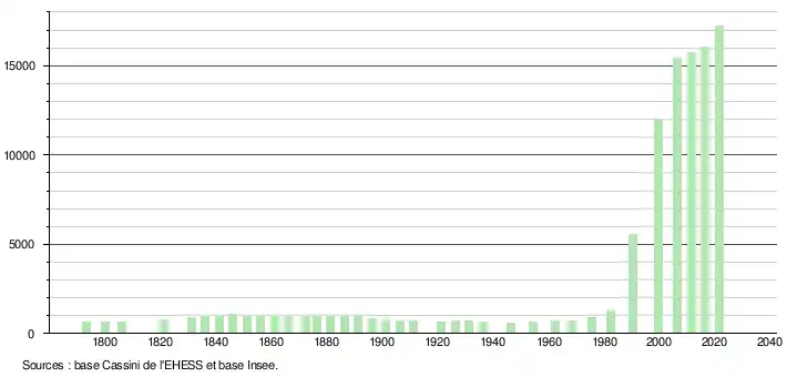 - Par convention dans Wikipédia, le principe a été retenu de n’afficher dans le tableau des recensements et le graphique, pour les populations légales postérieures à 1999, que les populations correspondant à une enquête exhaustive de recensement pour les communes de moins de 10 000 habitants, et que les populations des années 2006, 2011, 2016, etc. pour les communes de plus de 10 000 habitants, ainsi que la dernière population légale publiée par l’Insee pour l'ensemble des communes.
