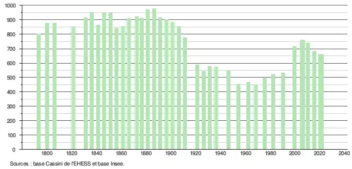 L'évolution du nombre d'habitants est connue à travers les recensements de la population effectués dans la commune depuis 1793. Pour les communes de moins de 10 000 habitants, une enquête de recensement portant sur toute la population est réalisée tous les cinq ans, les populations légales des années intermédiaires étant quant à elles estimées par interpolation ou extrapolation[20]. Pour la commune, le premier recensement exhaustif entrant dans le cadre du nouveau dispositif a été réalisé en 2005[21].