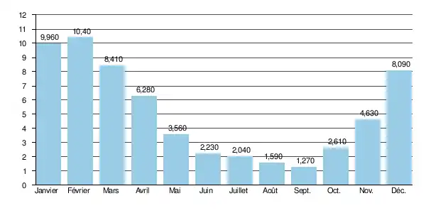 Les crues peuvent être assez importantes. Les QIX 2 et QIX 5 valent respectivement 27 et 39 m3/s. Le QIX 10 est de 47 m3/s, le QIX 20 de 55 m3/s et le QIX 50 de 65 m3/s. Ces valeurs de crue sont près du double de celles du Ton, affluent de la Chiers toute proche, et dont la surface de bassin comme la valeur du module sont fort voisins.