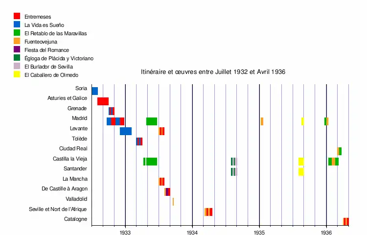 De sa création à la cessation de ses activités au début de la guerre civile (de à ), La Barraca effectue 21 tournées dans 74 villes, jouant un total de 13 œuvres[20] dans une centaine de représentations[1]. La première est La vie est un songe, de Calderón de la Barca, à El Burgo de Osma en , avant la première officielle à Madrid, dans le Cloître de San Bernardo[21].