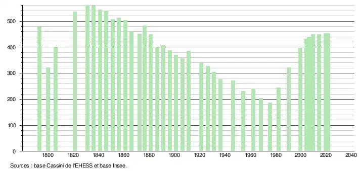 L'évolution du nombre d'habitants est connue à travers les recensements de la population effectués dans la commune depuis 1793. Pour les communes de moins de 10 000 habitants, une enquête de recensement portant sur toute la population est réalisée tous les cinq ans, les populations légales des années intermédiaires étant quant à elles estimées par interpolation ou extrapolation[27]. Pour la commune, le premier recensement exhaustif entrant dans le cadre du nouveau dispositif a été réalisé en 2004[28].