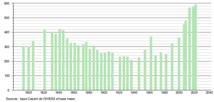L'évolution du nombre d'habitants est connue à travers les recensements de la population effectués dans la commune depuis 1793. Pour les communes de moins de 10 000 habitants, une enquête de recensement portant sur toute la population est réalisée tous les cinq ans, les populations légales des années intermédiaires étant quant à elles estimées par interpolation ou extrapolation[22]. Pour la commune, le premier recensement exhaustif entrant dans le cadre du nouveau dispositif a été réalisé en 2008[23].