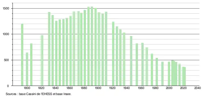L'évolution du nombre d'habitants est connue à travers les recensements de la population effectués dans la commune depuis 1793. Pour les communes de moins de 10 000 habitants, une enquête de recensement portant sur toute la population est réalisée tous les cinq ans, les populations légales des années intermédiaires étant quant à elles estimées par interpolation ou extrapolation[37]. Pour la commune, le premier recensement exhaustif entrant dans le cadre du nouveau dispositif a été réalisé en 2004[38].