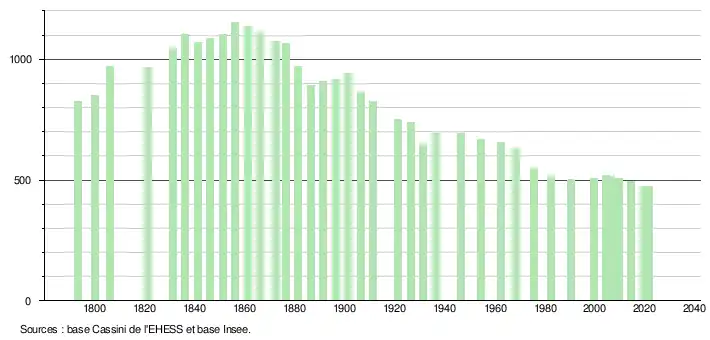 L'évolution du nombre d'habitants est connue à travers les recensements de la population effectués dans la commune depuis 1793. Pour les communes de moins de 10 000 habitants, une enquête de recensement portant sur toute la population est réalisée tous les cinq ans, les populations légales des années intermédiaires étant quant à elles estimées par interpolation ou extrapolation[21]. Pour la commune, le premier recensement exhaustif entrant dans le cadre du nouveau dispositif a été réalisé en 2004[22].