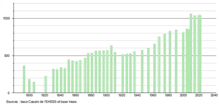 L'évolution du nombre d'habitants est connue à travers les recensements de la population effectués dans la commune depuis 1793. Pour les communes de moins de 10 000 habitants, une enquête de recensement portant sur toute la population est réalisée tous les cinq ans, les populations légales des années intermédiaires étant quant à elles estimées par interpolation ou extrapolation[19]. Pour la commune, le premier recensement exhaustif entrant dans le cadre du nouveau dispositif a été réalisé en 2004[20].