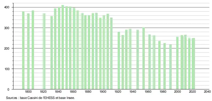 L'évolution du nombre d'habitants est connue à travers les recensements de la population effectués dans la commune depuis 1793. Pour les communes de moins de 10 000 habitants, une enquête de recensement portant sur toute la population est réalisée tous les cinq ans, les populations légales des années intermédiaires étant quant à elles estimées par interpolation ou extrapolation[25]. Pour la commune, le premier recensement exhaustif entrant dans le cadre du nouveau dispositif a été réalisé en 2005[26].