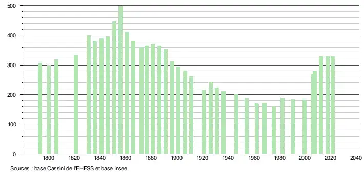L'évolution du nombre d'habitants est connue à travers les recensements de la population effectués dans la commune depuis 1793. Pour les communes de moins de 10 000 habitants, une enquête de recensement portant sur toute la population est réalisée tous les cinq ans, les populations légales des années intermédiaires étant quant à elles estimées par interpolation ou extrapolation[20]. Pour la commune, le premier recensement exhaustif entrant dans le cadre du nouveau dispositif a été réalisé en 2007[21].