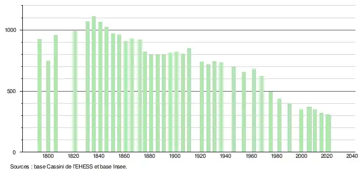 L'évolution du nombre d'habitants est connue à travers les recensements de la population effectués dans la commune depuis 1793. Pour les communes de moins de 10 000 habitants, une enquête de recensement portant sur toute la population est réalisée tous les cinq ans, les populations légales des années intermédiaires étant quant à elles estimées par interpolation ou extrapolation[25]. Pour la commune, le premier recensement exhaustif entrant dans le cadre du nouveau dispositif a été réalisé en 2005[26].