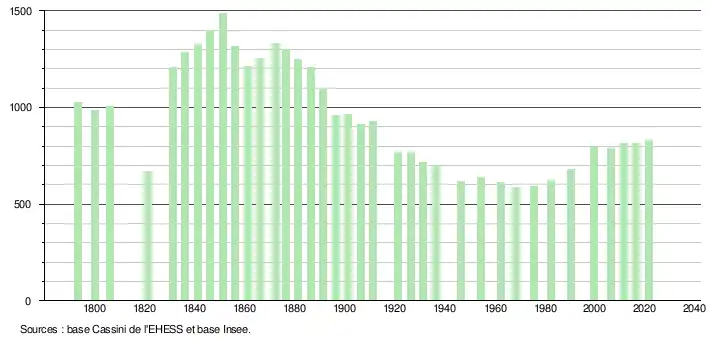 L'évolution du nombre d'habitants est connue à travers les recensements de la population effectués dans la commune depuis 1793. Pour les communes de moins de 10 000 habitants, une enquête de recensement portant sur toute la population est réalisée tous les cinq ans, les populations légales des années intermédiaires étant quant à elles estimées par interpolation ou extrapolation[30]. Pour la commune, le premier recensement exhaustif entrant dans le cadre du nouveau dispositif a été réalisé en 2006[31].
