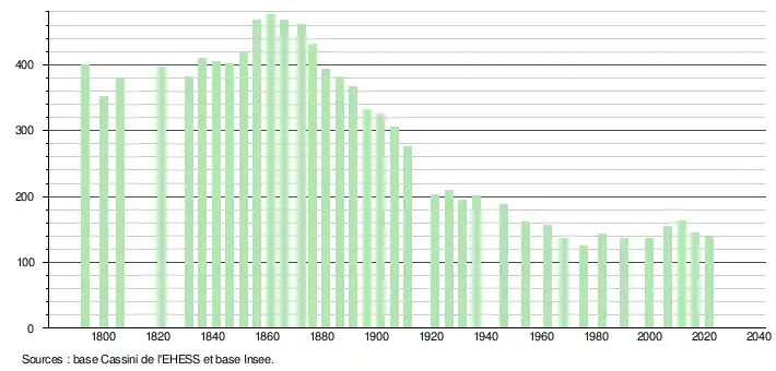 L'évolution du nombre d'habitants est connue à travers les recensements de la population effectués dans la commune depuis 1793. Pour les communes de moins de 10 000 habitants, une enquête de recensement portant sur toute la population est réalisée tous les cinq ans, les populations légales des années intermédiaires étant quant à elles estimées par interpolation ou extrapolation[17]. Pour la commune, le premier recensement exhaustif entrant dans le cadre du nouveau dispositif a été réalisé en 2006[18].