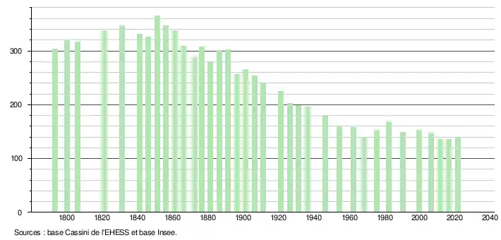 L'évolution du nombre d'habitants est connue à travers les recensements de la population effectués dans la commune depuis 1793. Pour les communes de moins de 10 000 habitants, une enquête de recensement portant sur toute la population est réalisée tous les cinq ans, les populations légales des années intermédiaires étant quant à elles estimées par interpolation ou extrapolation[30]. Pour la commune, le premier recensement exhaustif entrant dans le cadre du nouveau dispositif a été réalisé en 2006[31].