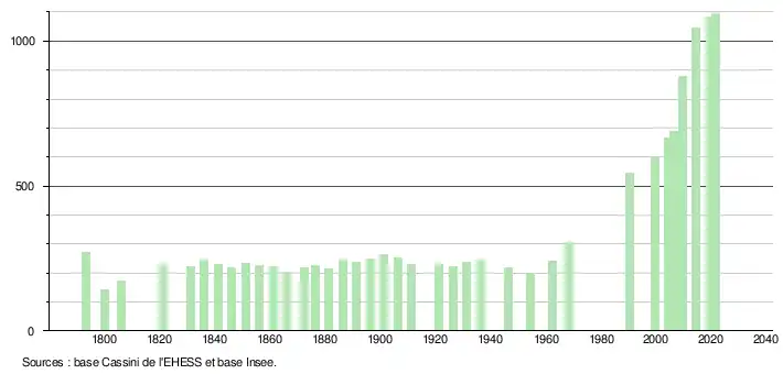 L'évolution du nombre d'habitants est connue à travers les recensements de la population effectués dans la commune depuis 1793. Pour les communes de moins de 10 000 habitants, une enquête de recensement portant sur toute la population est réalisée tous les cinq ans, les populations légales des années intermédiaires étant quant à elles estimées par interpolation ou extrapolation[21]. Pour la commune, le premier recensement exhaustif entrant dans le cadre du nouveau dispositif a été réalisé en 2004[22].