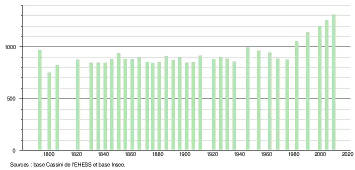 L'évolution du nombre d'habitants est connue à travers les recensements de la population effectués dans la commune depuis 1793. À partir du , les populations légales des communes sont publiées annuellement dans le cadre d'un recensement qui repose désormais sur une collecte d'information annuelle, concernant successivement tous les territoires communaux au cours d'une période de cinq ans. Pour les communes de moins de 10 000 habitants, une enquête de recensement portant sur toute la population est réalisée tous les cinq ans, les populations légales des années intermédiaires étant quant à elles estimées par interpolation ou extrapolation[6]. Pour la commune, le premier recensement exhaustif entrant dans le cadre du nouveau dispositif a été réalisé en 2004[7],[Note 1].