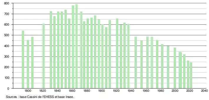 L'évolution du nombre d'habitants est connue à travers les recensements de la population effectués dans la commune depuis 1793. Pour les communes de moins de 10 000 habitants, une enquête de recensement portant sur toute la population est réalisée tous les cinq ans, les populations légales des années intermédiaires étant quant à elles estimées par interpolation ou extrapolation[16]. Pour la commune, le premier recensement exhaustif entrant dans le cadre du nouveau dispositif a été réalisé en 2007[17].