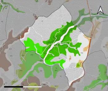 L'occupation des sols de la commune, telle qu'elle ressort de la base de données européenne d’occupation biophysique des sols Corine Land Cover (CLC), est marquée par l'importance des forêts et milieux semi-naturels (63,6 % en 2018), une proportion sensiblement équivalente à celle de 1990 (63 %). La répartition détaillée en 2018 est la suivante : forêts (63,6 %), zones agricoles hétérogènes (28,8 %), prairies (7,6 %)[31]. L'évolution de l’occupation des sols de la commune et de ses infrastructures peut être observée sur les différentes représentations cartographiques du territoire : la carte de Cassini (XVIIIe siècle), la carte d'état-major (1820-1866) et les cartes ou photos aériennes de l'IGN pour la période actuelle (1950 à aujourd'hui)[Carte 3].
