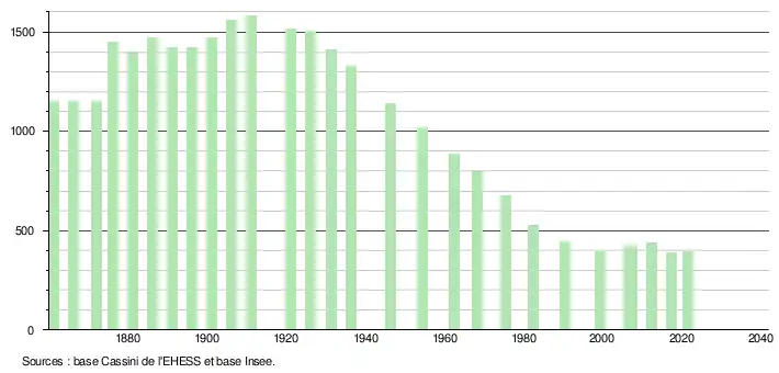 L'évolution du nombre d'habitants est connue à travers les recensements de la population effectués dans la commune depuis 1861. Pour les communes de moins de 10 000 habitants, une enquête de recensement portant sur toute la population est réalisée tous les cinq ans, les populations légales des années intermédiaires étant quant à elles estimées par interpolation ou extrapolation[26]. Pour la commune, le premier recensement exhaustif entrant dans le cadre du nouveau dispositif a été réalisé en 2007[27].