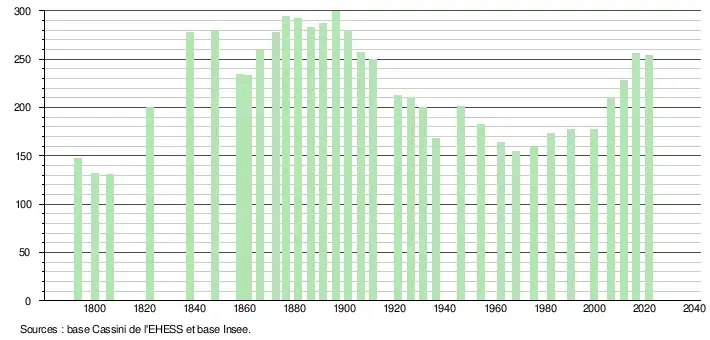 L'évolution du nombre d'habitants est connue à travers les recensements de la population effectués dans la commune depuis 1793. Pour les communes de moins de 10 000 habitants, une enquête de recensement portant sur toute la population est réalisée tous les cinq ans, les populations légales des années intermédiaires étant quant à elles estimées par interpolation ou extrapolation[17]. Pour la commune, le premier recensement exhaustif entrant dans le cadre du nouveau dispositif a été réalisé en 2006[18].