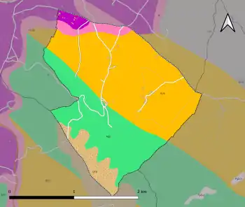 L'occupation des sols de la commune, telle qu'elle ressort de la base de données européenne d’occupation biophysique des sols Corine Land Cover (CLC), est marquée par l'importance des territoires agricoles (59,9 % en 2018), une proportion identique à celle de 1990 (59,9 %). La répartition détaillée en 2018 est la suivante : zones agricoles hétérogènes (59,3 %), forêts (40,1 %), prairies (0,6 %)[30]. L'évolution de l’occupation des sols de la commune et de ses infrastructures peut être observée sur les différentes représentations cartographiques du territoire : la carte de Cassini (XVIIIe siècle), la carte d'état-major (1820-1866) et les cartes ou photos aériennes de l'IGN pour la période actuelle (1950 à aujourd'hui)[Carte 3].