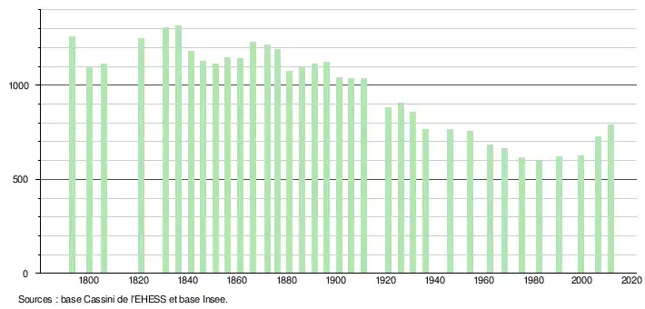 L'évolution du nombre d'habitants est connue à travers les recensements de la population effectués dans la commune depuis 1793. À partir du , les populations légales des communes sont publiées annuellement dans le cadre d'un recensement qui repose désormais sur une collecte d'information annuelle, concernant successivement tous les territoires communaux au cours d'une période de cinq ans. Pour les communes de moins de 10 000 habitants, une enquête de recensement portant sur toute la population est réalisée tous les cinq ans, les populations légales des années intermédiaires étant quant à elles estimées par interpolation ou extrapolation[17]. Pour la commune, le premier recensement exhaustif entrant dans le cadre du nouveau dispositif a été réalisé en 2006[18],[Note 1].