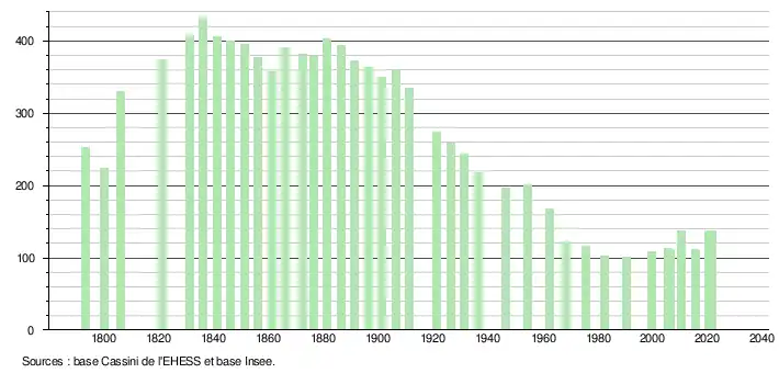 L'évolution du nombre d'habitants est connue à travers les recensements de la population effectués dans la commune depuis 1793. Pour les communes de moins de 10 000 habitants, une enquête de recensement portant sur toute la population est réalisée tous les cinq ans, les populations légales des années intermédiaires étant quant à elles estimées par interpolation ou extrapolation[16]. Pour la commune, le premier recensement exhaustif entrant dans le cadre du nouveau dispositif a été réalisé en 2005[17].