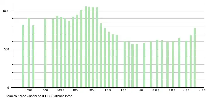 L'évolution du nombre d'habitants est connue à travers les recensements de la population effectués dans la commune depuis 1793. À partir du , les populations légales des communes sont publiées annuellement dans le cadre d'un recensement qui repose désormais sur une collecte d'information annuelle, concernant successivement tous les territoires communaux au cours d'une période de cinq ans. Pour les communes de moins de 10 000 habitants, une enquête de recensement portant sur toute la population est réalisée tous les cinq ans, les populations légales des années intermédiaires étant quant à elles estimées par interpolation ou extrapolation[12]. Pour la commune, le premier recensement exhaustif entrant dans le cadre du nouveau dispositif a été réalisé en 2004[13],[Note 1].