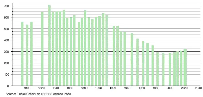 L'évolution du nombre d'habitants est connue à travers les recensements de la population effectués dans la commune depuis 1793. Pour les communes de moins de 10 000 habitants, une enquête de recensement portant sur toute la population est réalisée tous les cinq ans, les populations légales des années intermédiaires étant quant à elles estimées par interpolation ou extrapolation[17]. Pour la commune, le premier recensement exhaustif entrant dans le cadre du nouveau dispositif a été réalisé en 2005[18].