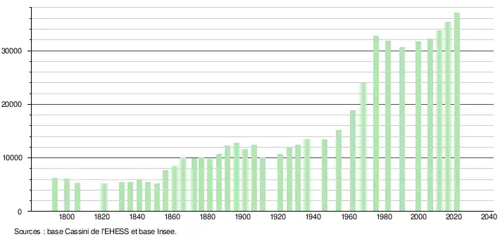 - Par convention dans Wikipédia, le principe a été retenu de n’afficher dans le tableau des recensements et le graphique, pour les populations légales postérieures à 1999, que les populations correspondant à une enquête exhaustive de recensement pour les communes de moins de 10 000 habitants, et que les populations des années 2006, 2011, 2016, etc. pour les communes de plus de 10 000 habitants, ainsi que la dernière population légale publiée par l’Insee pour l'ensemble des communes.