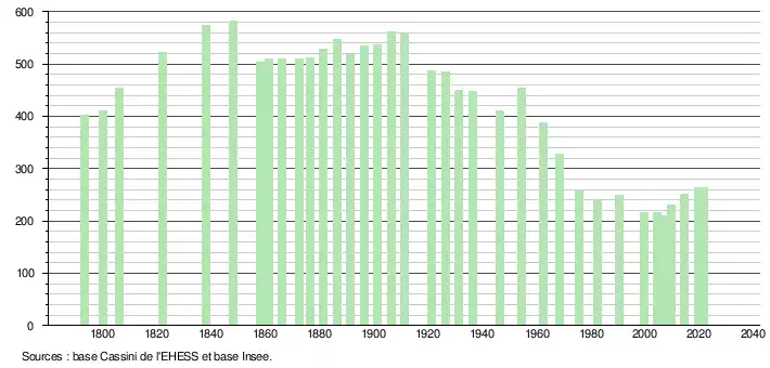 L'évolution du nombre d'habitants est connue à travers les recensements de la population effectués dans la commune depuis 1793. Pour les communes de moins de 10 000 habitants, une enquête de recensement portant sur toute la population est réalisée tous les cinq ans, les populations légales des années intermédiaires étant quant à elles estimées par interpolation ou extrapolation[20]. Pour la commune, le premier recensement exhaustif entrant dans le cadre du nouveau dispositif a été réalisé en 2004[21].