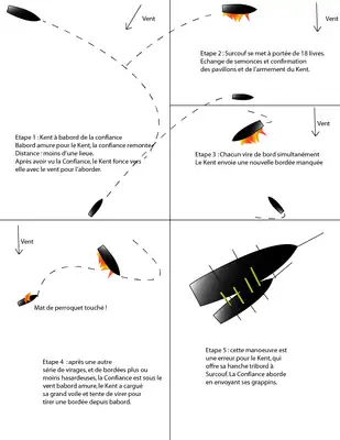 Le , la Confiance rencontre l'indiaman Kent, commandé par le capitaine Rivington, 1 200 tonneaux, 40 canons, chargé de 450 personnes. Évitant un duel d'artillerie qui lui serait défavorable, Surcouf aborde le Kent par sa hanche tribord et monte à l'abordage. Après une heure et demie de combat[6] les Français prennent le contrôle du Kent[7]. Le Français Louis Garneray, qui se trouve à bord comme enseigne, en fait le récit et immortalise la scène par une de ses plus célèbres peintures.