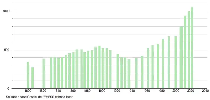 L'évolution du nombre d'habitants est connue à travers les recensements de la population effectués dans la commune depuis 1800. Pour les communes de moins de 10 000 habitants, une enquête de recensement portant sur toute la population est réalisée tous les cinq ans, les populations légales des années intermédiaires étant quant à elles estimées par interpolation ou extrapolation[17]. Pour la commune, le premier recensement exhaustif entrant dans le cadre du nouveau dispositif a été réalisé en 2007[18].